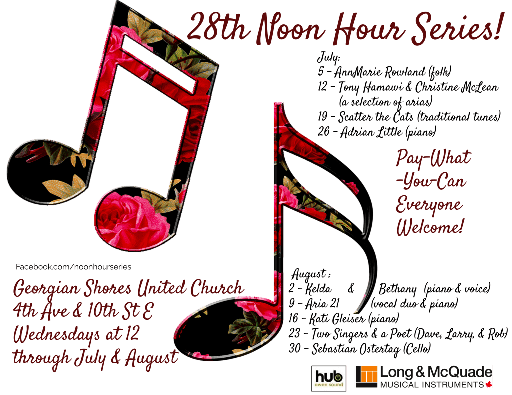 2023 marks the return of the Annual Noon Hour Series at Georgian Shores United Church, every Wednesday at noon beginning July 5th. Each week we will be presenting music performed by local favourites, and nationally acclaimed musicians. Georgian Shores United Church Every Wednesday at Noon to 1pm