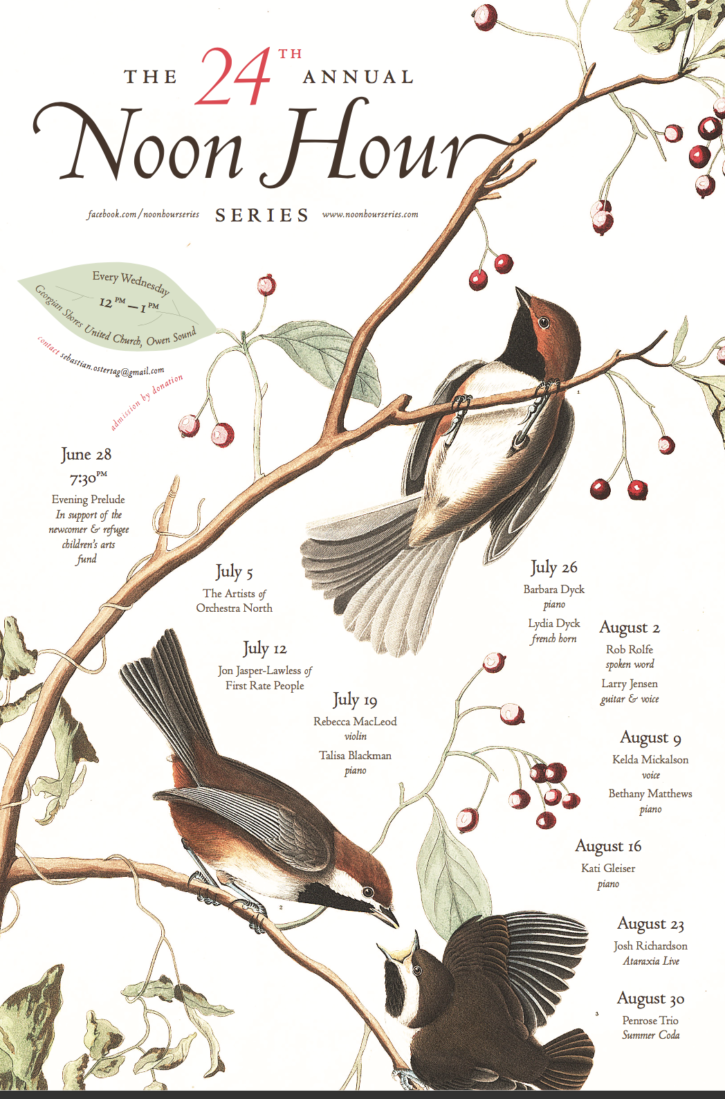 On June 28th, at 7:30pm, the season will begin with a special evening concert in support of the Newcomer and Refugee Children’s Arts Fund in Grey-Bruce. This special event will feature Our Shotgun Wedding, Larry Jensen and Rob Rolfe, May Ip, Kelda Mickalson and Bethany Matthews, special guests, and the Noon Hour Series Orchestra under the direction of Samuel Tam. As always, all concerts and events are by donation!